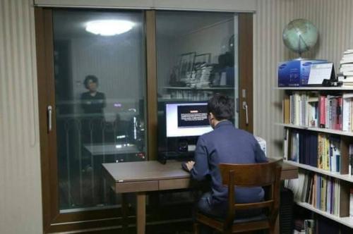 설정샷이죠. 일단 창문에 너무 잘 비춰요. 그리고 찍은사람도 따로 있고, 방문도 열려있고...