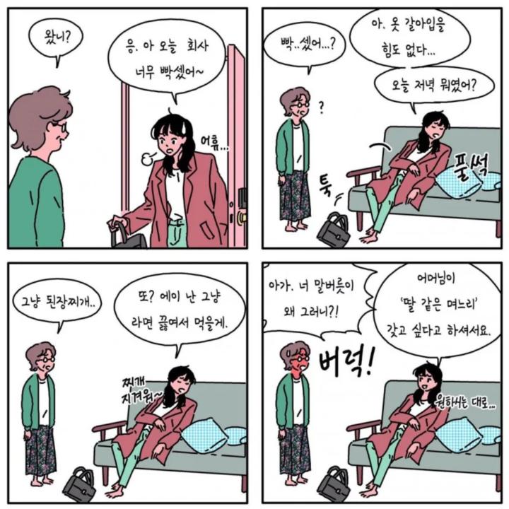 맞죠 퇴근하고 집에 들어와서 엄마 밥 좀 줘 하며 가방 옷 다 침대위에 던지면서 얘기해야 딸 같죠 |