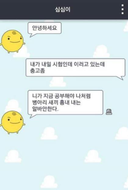 심심이보다보면 너무 예리해서 사람 같을때 있더라구요 ㅋㅋ |
