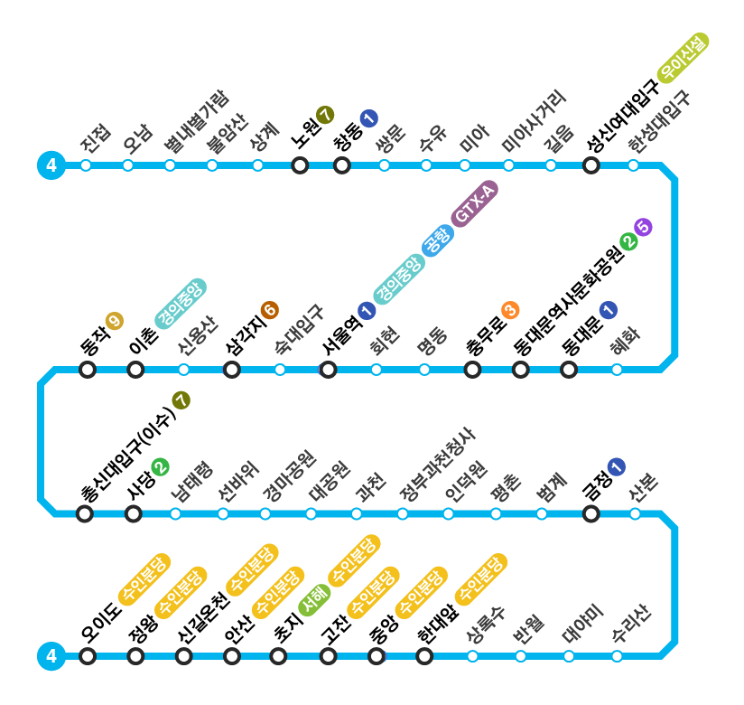 1985년 개통 후 꾸준히 확장되어 현재는 수도권 광역 교통의 핵심축 중 하나로 자리잡았으며, 특히 서울역·명동·동대문·혜화·사당 등 도심·관광·업무지구를 직접 지나 일상 통근과 관광 수요가 모두 집중되는 노선입니다. 또한 1호선, 2호선, 3호선 등 주요 노선과 다수 환승이 가능해 서울 전역 어디든 이동할 수 있는 편리한 환승 체계를 갖추고 있습니다.