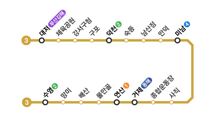 부산 지하철 3호선은 오륙도역에서 수영역까지 연결되는 노선으로, 부산광역시 남부 지역과 해운대·수영 일대를 중심으로 시민들의 출퇴근, 통학, 상업 활동을 지원하는 중요한 도시철도입니다. 3호선은 주로 남부 주거지와 상업지구를 연결하며, 해운대, 수영, 남천 등 중심 환승역에서 2호선과 연결되어 부산 전역으로의 접근성을 제공합니다.