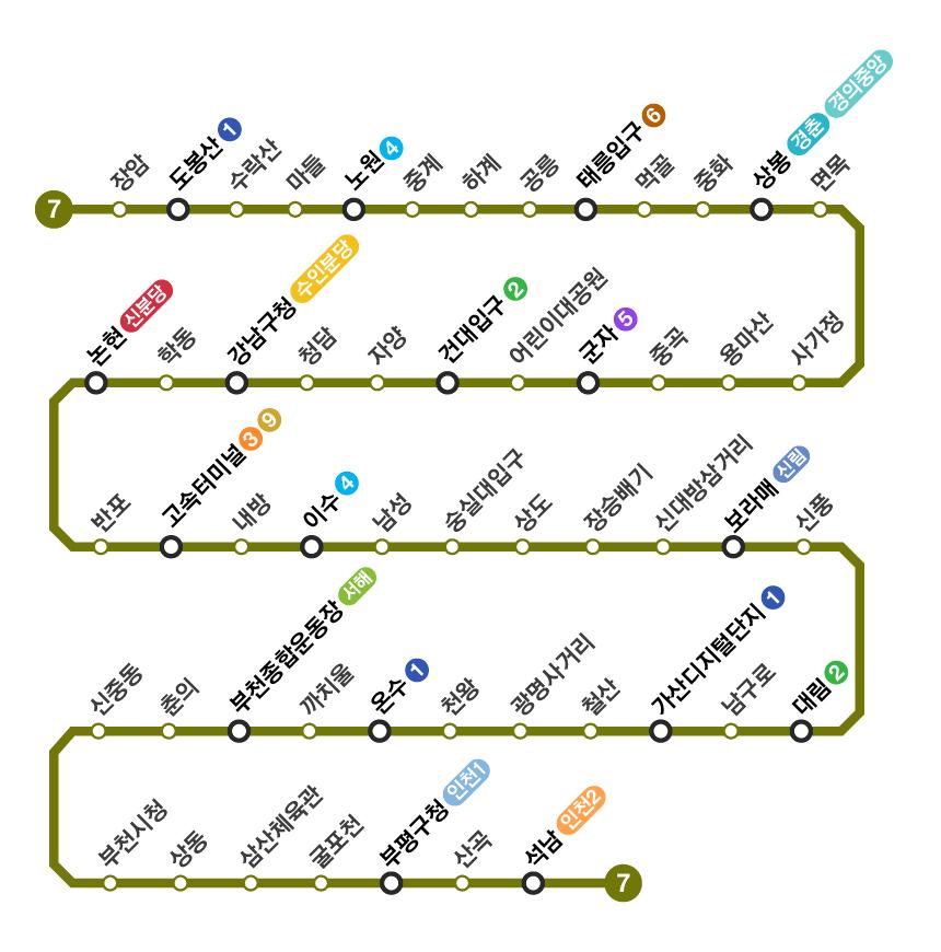 결론적으로, 서울 지하철 7호선 노선도는 장암, 건대입구, 상봉, 부평구청 등 서울과 수도권 주요 지역을 연결하는 핵심 지하철로, 출퇴근, 통학, 상업·업무지역 접근성을 동시에 지원하며 시민과 방문객 모두에게 중요한 이동 수단입니다.