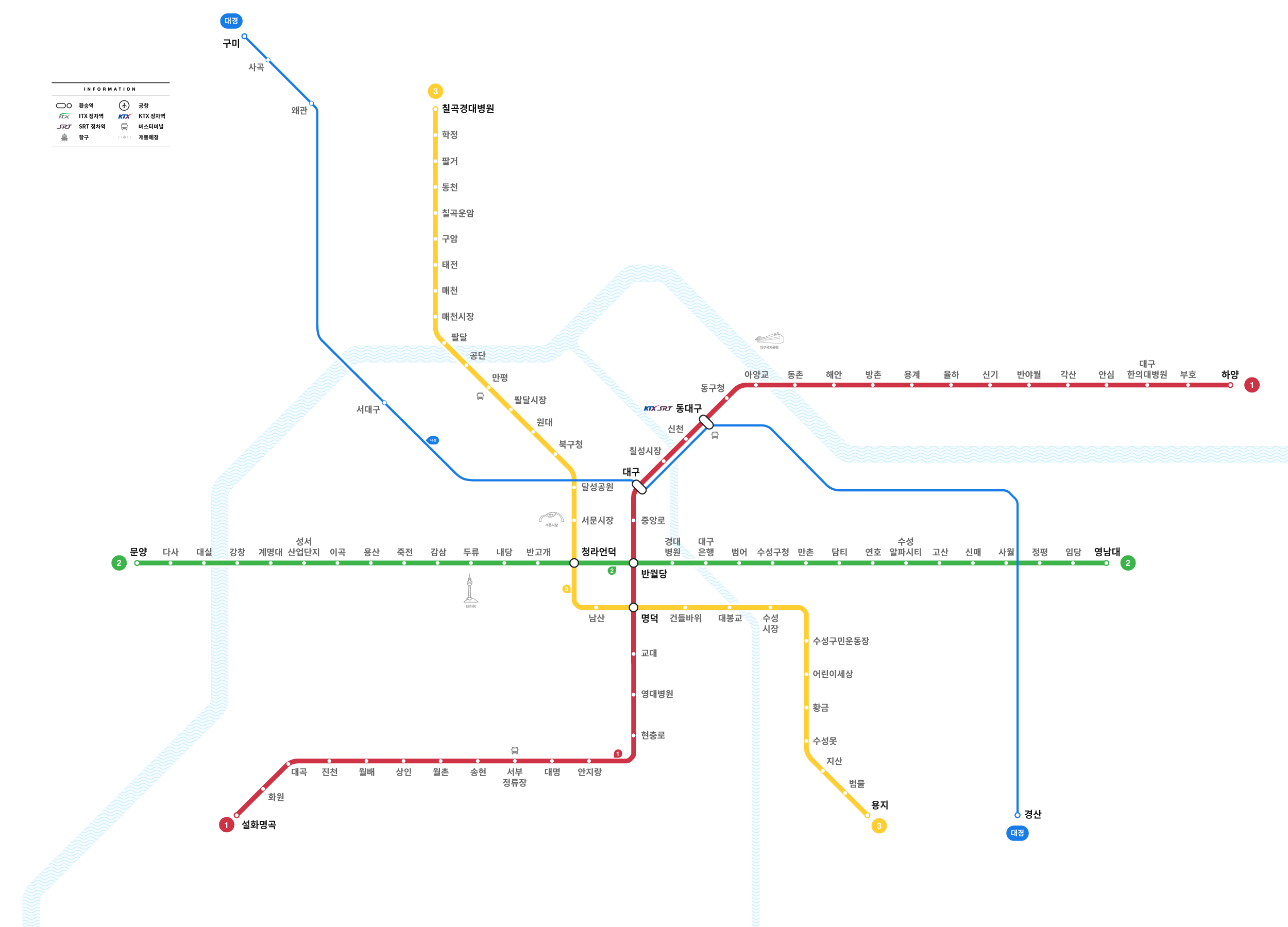대구 지하철은 대구광역시 내 주요 지역을 연결하는 도시철도로, 시민들의 출퇴근, 통학, 상업·업무지역 접근성을 동시에 지원합니다. 대구 지하철 노선도를 활용하면 1호선, 2호선, 3호선을 중심으로 대구 전역의 이동 경로를 효율적으로 계획할 수 있으며, 지역 간 이동 시간을 단축하고 교통 혼잡을 완화할 수 있습니다.