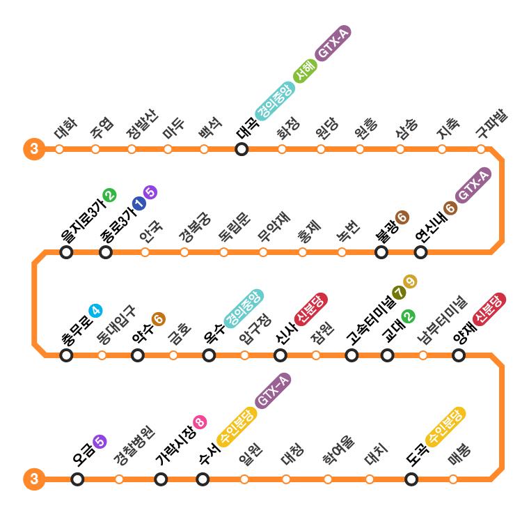 특히 대화·일산·삼송 등 경기 북부 지역의 주거지와, 종로·경복궁·을지로·강남 업무지구를 거쳐, 수서·가락시장·오금 등 남부 생활권까지 연결하는 덕분에 출퇴근 및 통학 수요가 매우 높은 노선입니다. 또한 다수의 환승역을 거치며 서울 지하철 다른 노선과 긴밀히 연결되어 이동 편의성이 뛰어납니다.