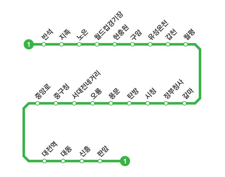 대전 지하철은 현재 1호선 단일 노선으로 운영되고 있으며, 대전광역시 동구 판암역에서 출발해 서구 정부청사역을 지나 서쪽의 반석역까지 이어집니다. 총 연장은 약 22km, 22개 역으로 구성되어 있으며, 대전의 동서를 관통하면서 시민들의 주요 통근·통학 교통수단으로 자리 잡고 있습니다. 특히 시청, 정부청사, 대전역, 유성 등 핵심 행정·상업·주거 지역을 연결해 대전 시민들의 생활 편의를 크게 높이고 있습니다.