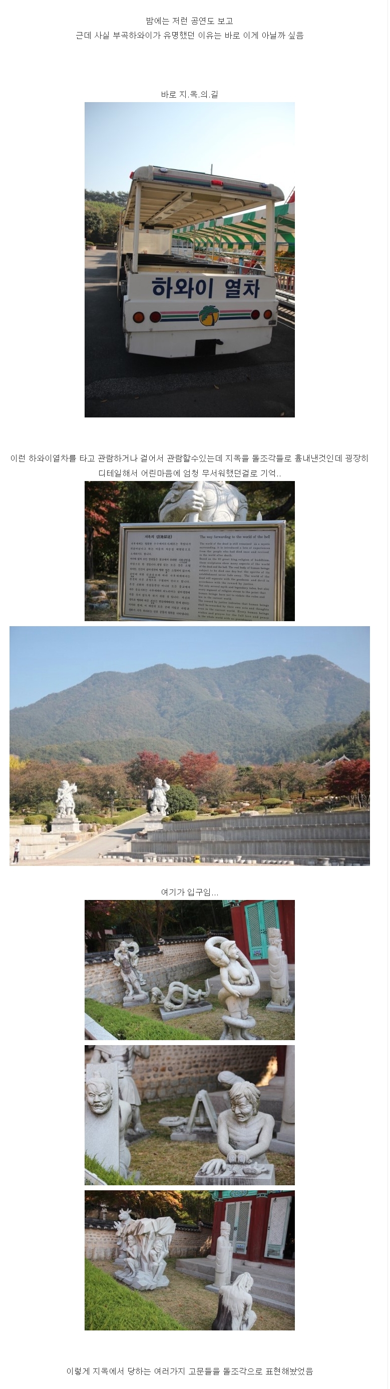 너무 어릴 때 갔었는지...마지막 사진과 비슷한 공연만 물 안에서 구경했던 기억이 있네요...ㅎ...아...물놀이 끝나고 온천가서 씻고 나오려는데...왜 꼭 수건을 잘 간수하라는지 몰랐는데...한 어른이 제 수건 뺏어가길레...원래 목욕탕에는 수건 다 있는거 아냐? 하고 그냥 줬는데 나오고 보니 수건이 사는거였던 가슴 아픈 기억도...