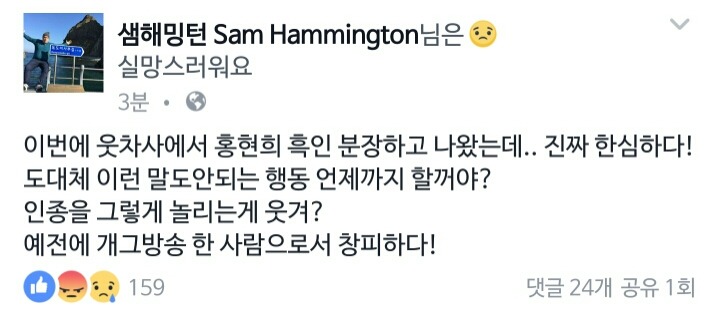 인종차별의 나라 호주출신 샘해밍턴이 저런말을 하니 좀 웃기긴 하네요 근데 이건 인종차별 맞습니다.. 어쨋든 인종을 가지고 개그의 소재로 희화화 했으니.. |