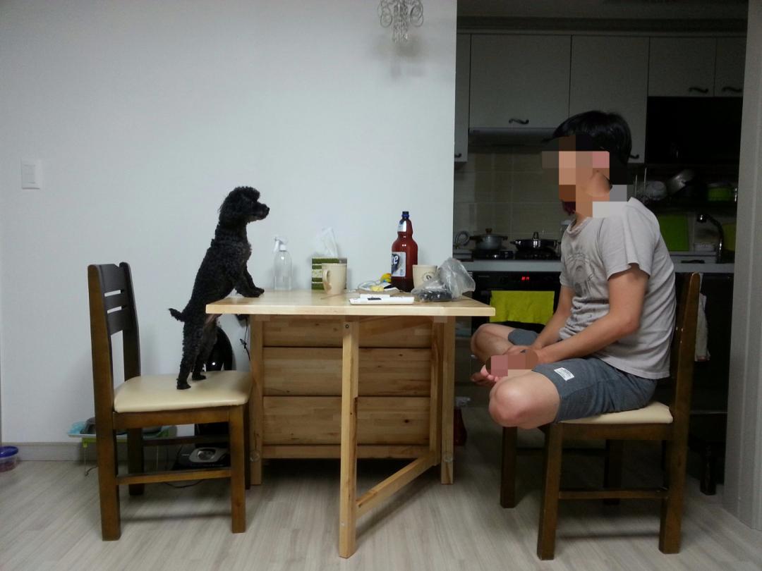 (오른발로 식탁을 탕탕 치며 )나도 한잔 줘봐