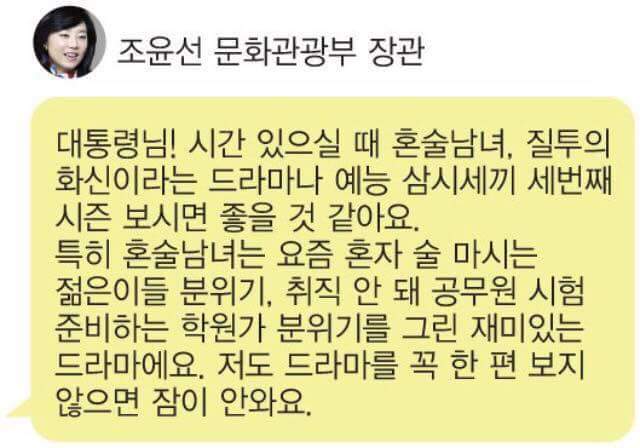 대통령이 평소에 학술서적에 파묻히거나 정책 공부만 밤새워 하는 스타일이라면 굳이 조윤선도 드라마 제목만 알려주고 말았을텐데