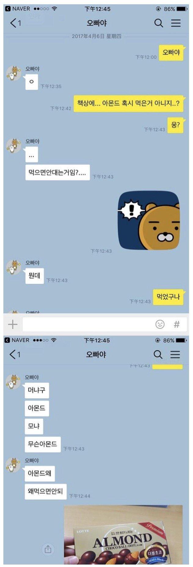 초콜릿 빨아먹고 아몬드만 남겨둔걸... 오빠가 먹은듯...ㅋㅋㅋㅋ |