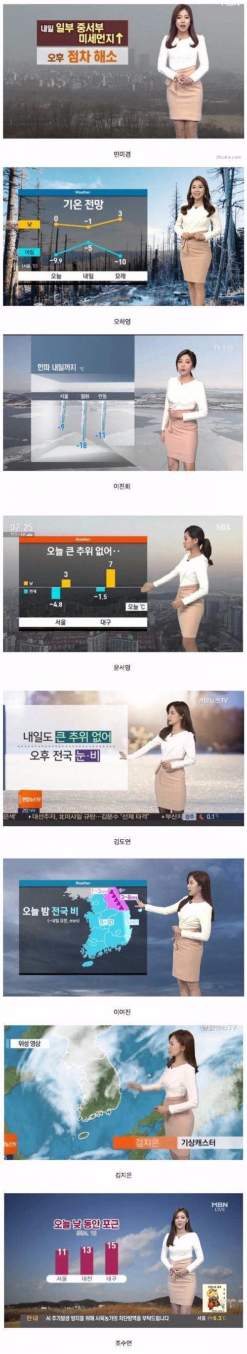 우리가 이름만 들어도 알 수 있는 수준의 방송사는 의상팀이 있습니다. 방송사가 사업 공고를 내면 각 업체들이 입찰해서 들어오죠. 이런 의상팀은 아니운서 기자 기상캐스터 등의 방송용 의상을 전담합니다. 각 출연자의 신체 특징과 본인의 취향, 제작진의 요구를 종합하고 각 프로그램 출연자들의 의산 콘셉트를 종합해 의상을 결정합니다. 아주 가끔 출연자 본인이 ‘난 내 옷 가져온 거 입을래’ 하는 경우도 있지만 상황상 맞으면 가능한 건고 그렇지 않은 경우가 더 많죠. 의상실들도 직접 구매하는 옷, 직접 제작하는 옷, 협찬이 들어온 옷 등을 운용하는데 이 자료의 의상은 제작 업체가 적극적으로 의상실 사람들에게 협찬을 한 것 같네요. 보통 한 옷이 이렇게까지 돌지는 않는데 말이죠. | ||