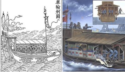 농사에 쓰이는 수차의 원리를 이용하여 만든 배.