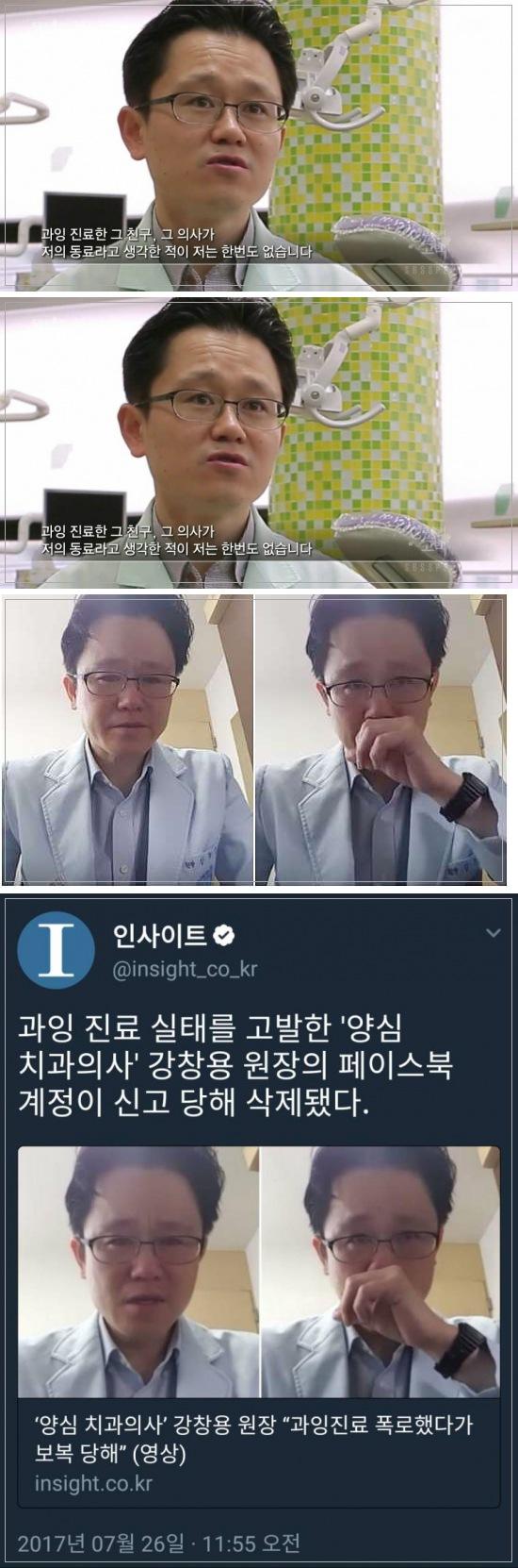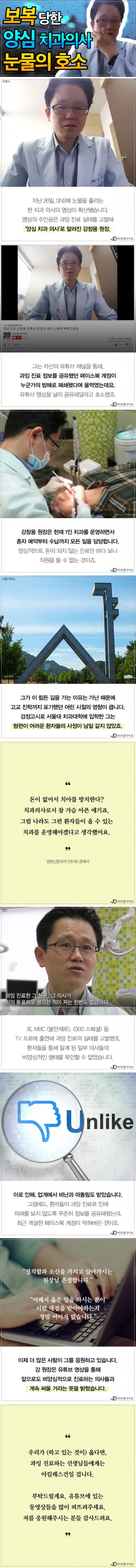 치과계의 과잉 진료 행태를 알리며 ‘양심 치과 의사’로 알려진 강창용 원장이 여전히 고독한 싸움을 하고 있는 것으로 전해졌다. 강 원장의 페이스북 계정은 신고를 받아 10여일 만에 폐쇄됐고, 강 원장은 유튜브로 이 사실을 전하며 눈물을 보였다.
