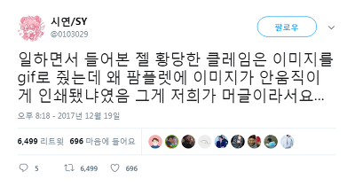 작업자가 gif에서 어떤 컷을 쓸건지 확인 했어야지 않나요? 그리고 시안을 주고 컨펌 다 받고 인쇄 들어가는게 저건 주작인듯 | ||