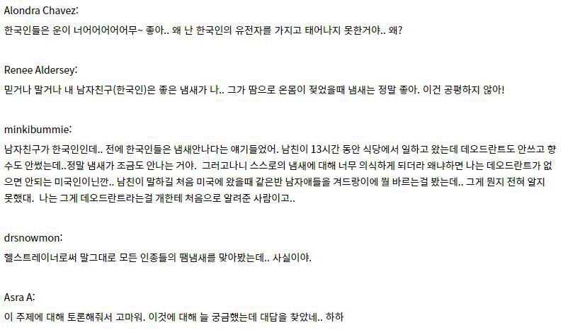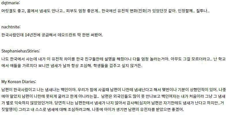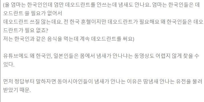 결론 : 한국인들이 냄새 안나는건 한국인의 유전자 덕분.