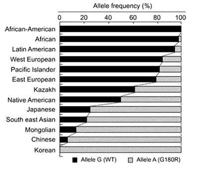 그 위로는 동아시아인들이 차지하고 그외 흑인,백인들의 대부분이 G대립 유전자를 많이 가지고 있다.