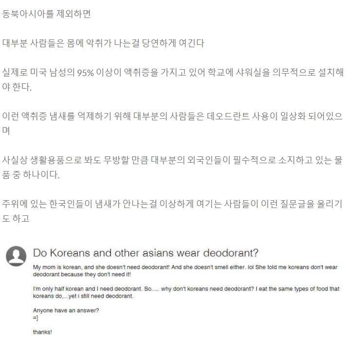 착각하면 안되는게 매일 씻는 미흑인보다 잘 안씻는 한국인이 냄새가 안난다는 말은 아닙니다. 상위권에 속하는 중국인들 냄새에 불쾌해하는 외국인들 많습니다. |