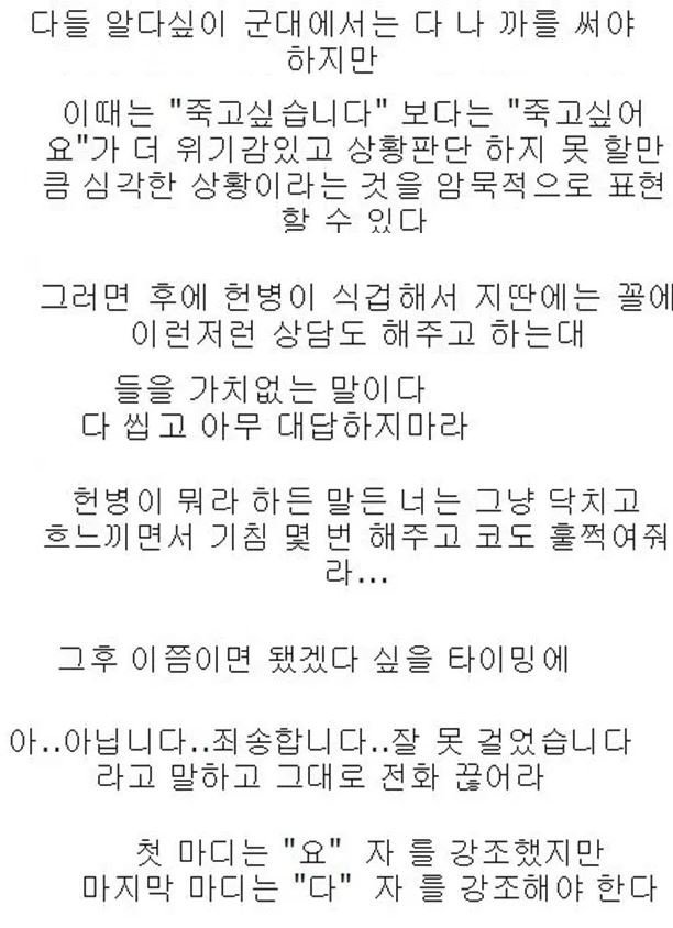 현재는 어떻게 바뀌었는지 모르겠지만, 제가 전역하던 08년도까진 이런거 찌르면 군생활을 편하게 보내는게 아니라 정말 말그대로 '깍두기' 신세가 되죠. 중대내에 사고친 사회성 결여된 인원이 두어명 있었는데 무슨 근무열외,작업열외에... 환자복만 안입었지 정말 정신병원 환자들 같이 멍하게 창밖이나 보며 하루하루 시간 보내더군요. ...진심 할짓 아닌거 같아보였습니다.물론 몸은 편하겠죠...
