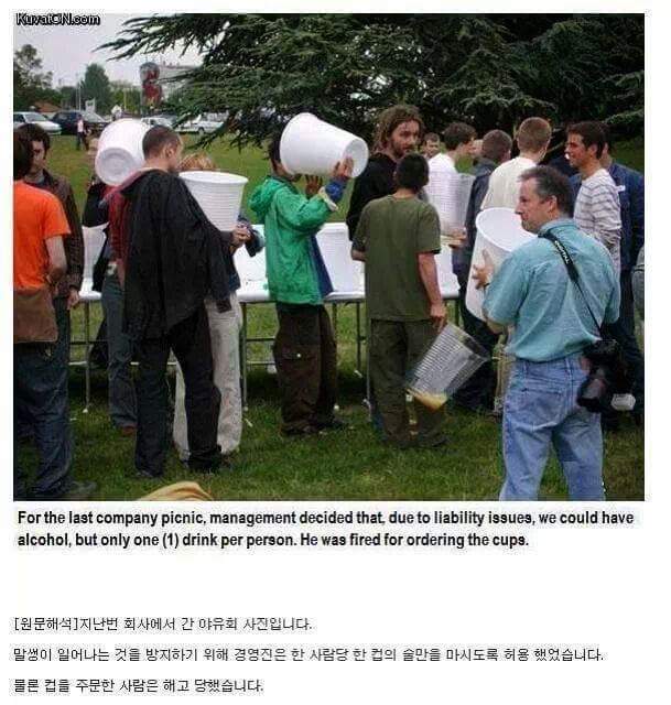 사장 : 나도 한 컵만 마셨는데 어쩌다 보니 해고서에 당신 이름이 있더라고. 한 컵뿐이었는데 취했나봐... |