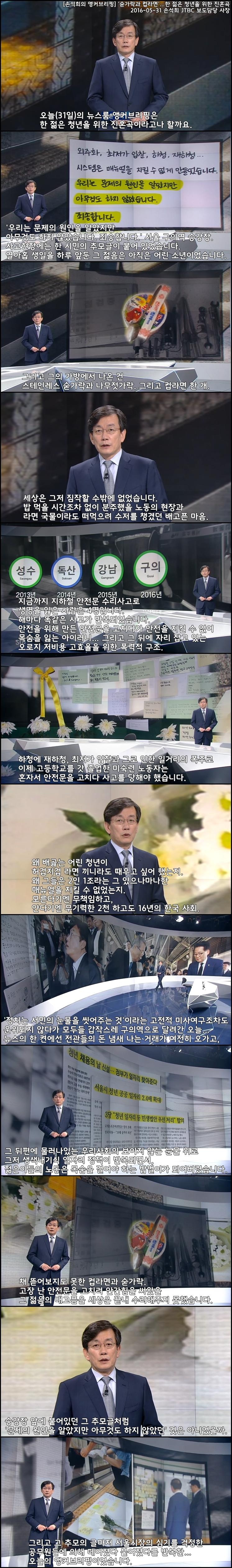 [손석희의 앵커브리핑] '숟가락과 컵라면'...한 젊은 청년을 위한 진혼곡 > 유머게시판