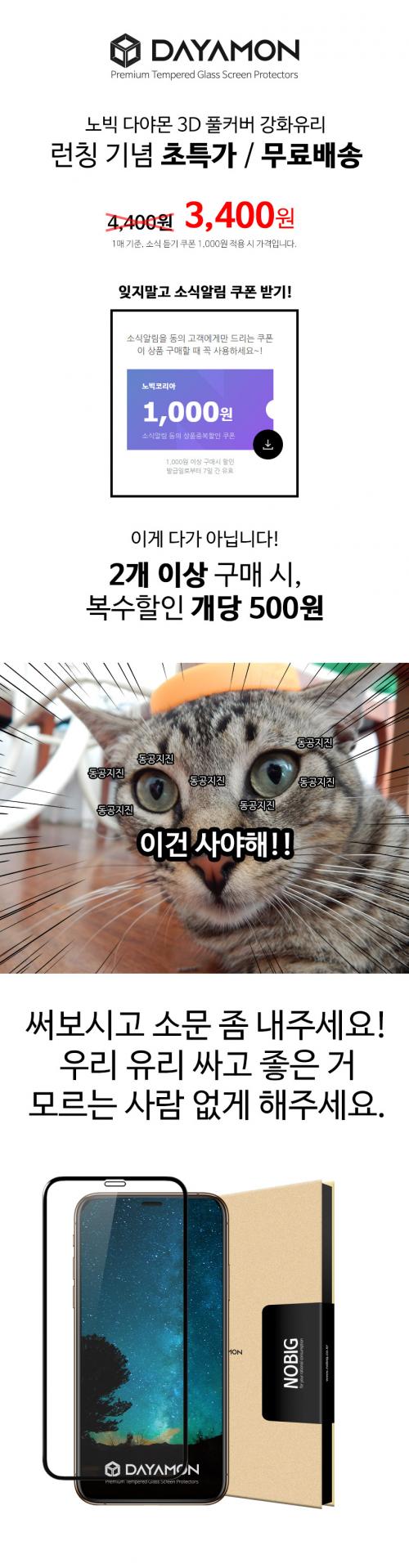 상세페이지에 보이는 소식알림 동의 쿠폰을 받고 3D 풀커버 강화유리를 3,400원 무료배송으로 만나보세요!