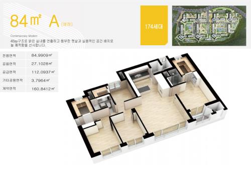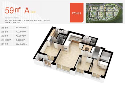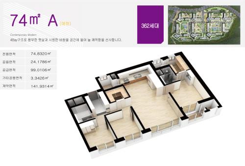 펜트하우스형 복층아파트 설계의 84㎡ 타입은 공간 활용성에 확트인 개방감을 느리는 넓은 라이프 스타일을 누릴 수 있으며 74㎡ 주택형은 테라스형 아파트로 품격 있는 휴식 속에 자연을 가까이 누리는 여유로운 생활이 가능하다. 또한 59㎡ 타입은 방 3개에 4Bay 타입과 대형 전실을 서비스로 제공해 구 30형대 면적과 같은 공간활용을 할 수 있다.