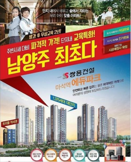 ‘마석역 쌍용 에듀파크’는 쌍용건설이 시공예정사로 참여하면서 3.3㎡당 600만원대라는 저렴한 공급가와 더불어 무료로 운영될 계획인 방과후 교육센터 등 단지 내 원스톱 교육시스템을 완비하며 호평을 얻고 있다.