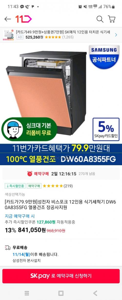 SKPAY 5%(카드등록해야함) 적용해야지 해당가격으로 진행되네요!