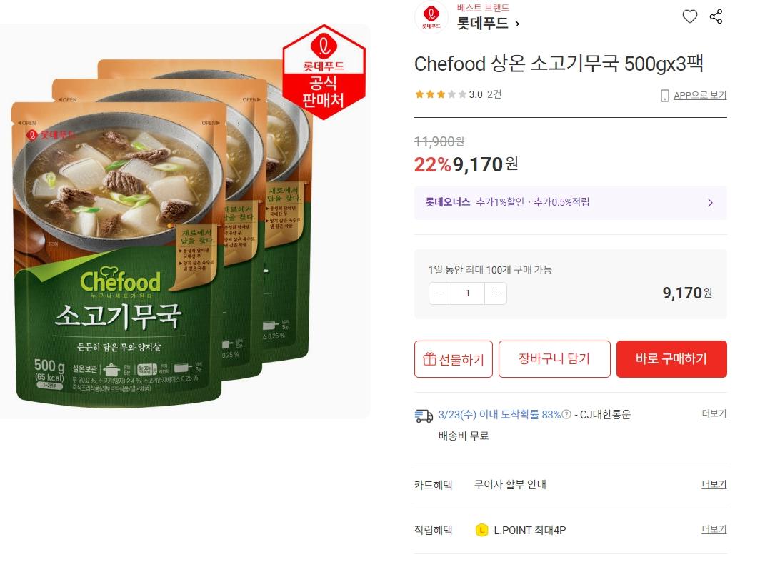 [롯데ON] Chefood 상온 소고기무국 500gx3팩 9,170원 무배