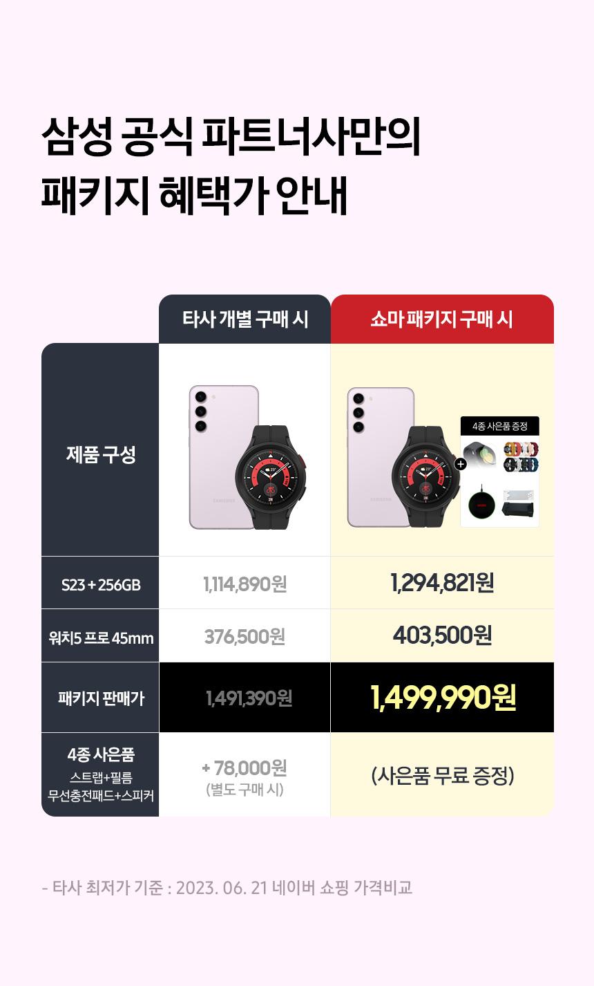 [삼성모바일전문몰][패키지] 갤럭시 S23 플러스 256GB + 갤럭시 워치5 프로 45mm / 워치 스트랩+보호필름+BlueBeat-M 스피커+무선충전패드(1,499,990원/무료)