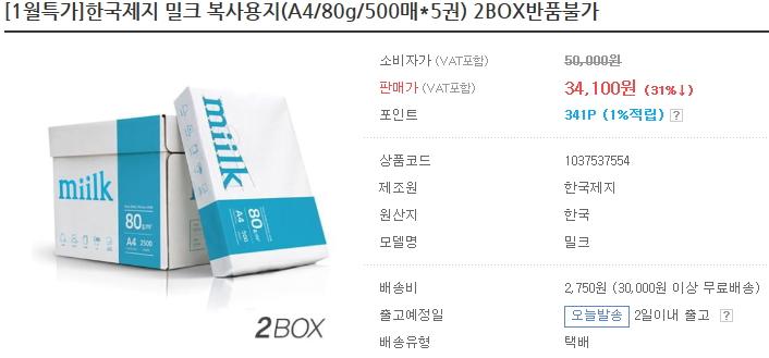 [아이마켓] 한국제지 밀크 복사용지(A4/80g/500매*5권)*2BOX (34,100원/무료배송) > 상품홍보