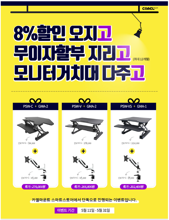스탠딩책상 카멜 스탠워크 구매시 10만원 상당 모니터 거치대 100% 증정(12개월 무이자 할부, 8% 추가 할인) > 상품홍보