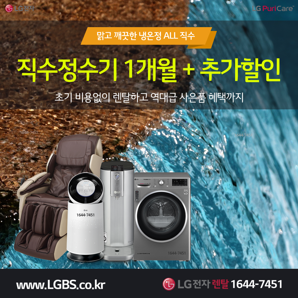 - 직수정수기 1개월 무료 / 장기요금할인 (3개월 방문케어, 매년 직수관 무상교체)