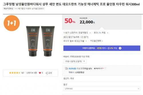 [11번가] 그루밍랩 남성올인원바디워시 샴푸 세안 면도 데오드란트 기능성 에너제틱 프로 올인원 타우린 워시300ml카테고리초이스 (22,000원/무료) > 상품홍보