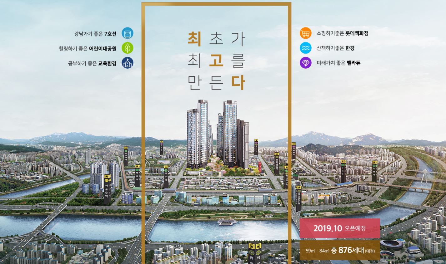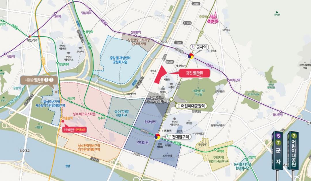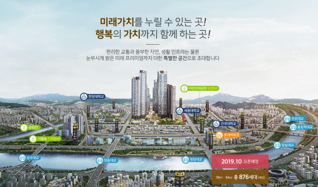 특히 건대입구~능동로 일대 대규모 캠퍼스타운 조성, 구의·자양재정비촉진지구 개발, 중랑물재생센터 공원화, 동서울터미널 현대화 사업 등 개발호재가 풍부해 미래가치 상승이 기대된다.