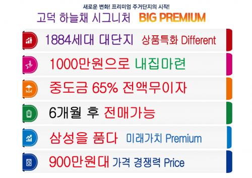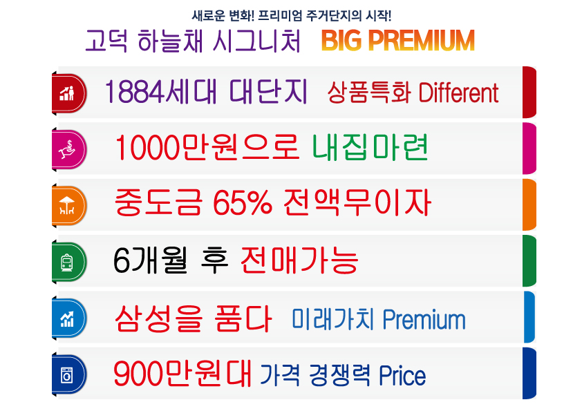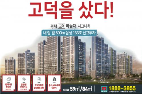 고덕 내 유일한 59㎡, 전매기한 단 6개월, 평당 900만원대의 분양가, 중도금 무이자이며, 견본주택은 경기도 평택시 세교동에 마련됐다.