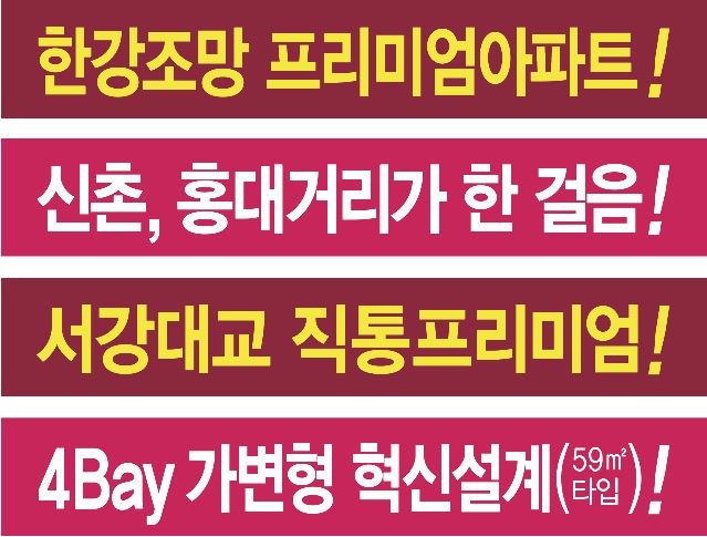 명문대학교도 많은데요~ 도보로 통학할 수 있는 홍익대, 서강대와 연세대, 이화여대, 추계예술대, KGU 경기대, 숙명여대 등 명문대학교가 인접한 학군이 우수한 지역입니다.