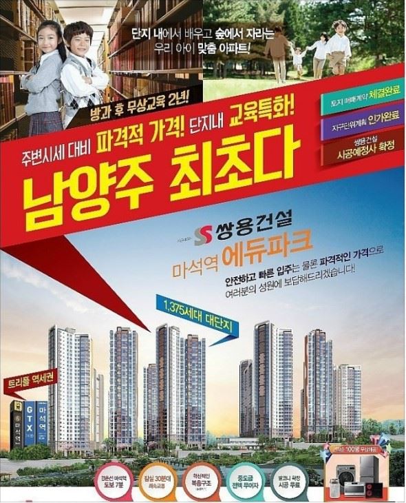 ‘마석역 쌍용 에듀파크’는 쌍용건설이 시공예정사로 참여하면서 3.3㎡당 600만원대라는 저렴한 공급가와 더불어 무료로 운영될 계획인 방과후 교육센터 등 단지 내 원스톱 교육시스템을 완비하며 호평을 얻고 있다.