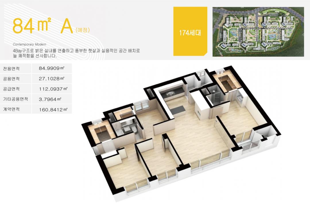 펜트하우스형 복층아파트 설계의 84㎡ 타입은 공간 활용성에 확트인 개방감을 느리는 넓은 라이프 스타일을 누릴 수 있으며 74㎡ 주택형은 테라스형 아파트로 품격 있는 휴식 속에 자연을 가까이 누리는 여유로운 생활이 가능하다. 또한 59㎡ 타입은 방 3개에 4Bay 타입과 대형 전실을 서비스로 제공해 구 30형대 면적과 같은 공간활용을 할 수 있다.