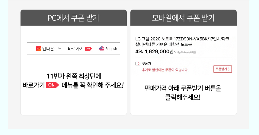 PC : 좌측 최상단에서 바로가기 ON 메뉴 확인 후 결제페이지 쿠폰할인 ->