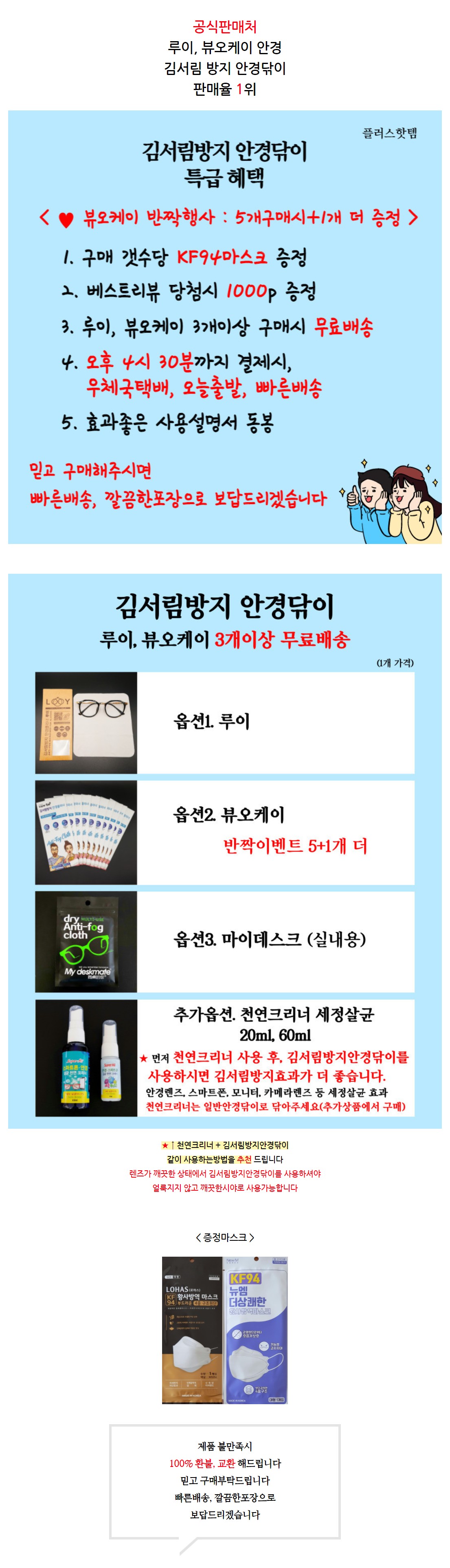 그리고 사은품으로 김서림방지안경닦이 구매수량마다 KF94마스크도 증정해드리고 있습니다
