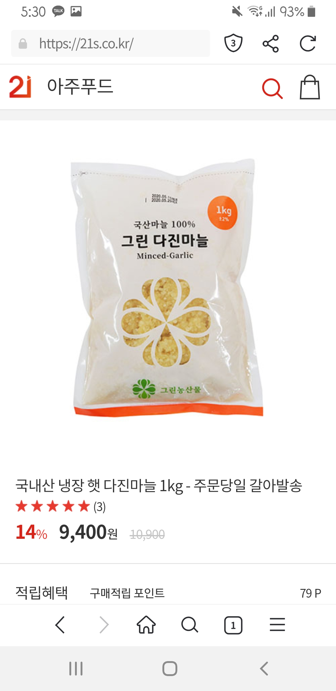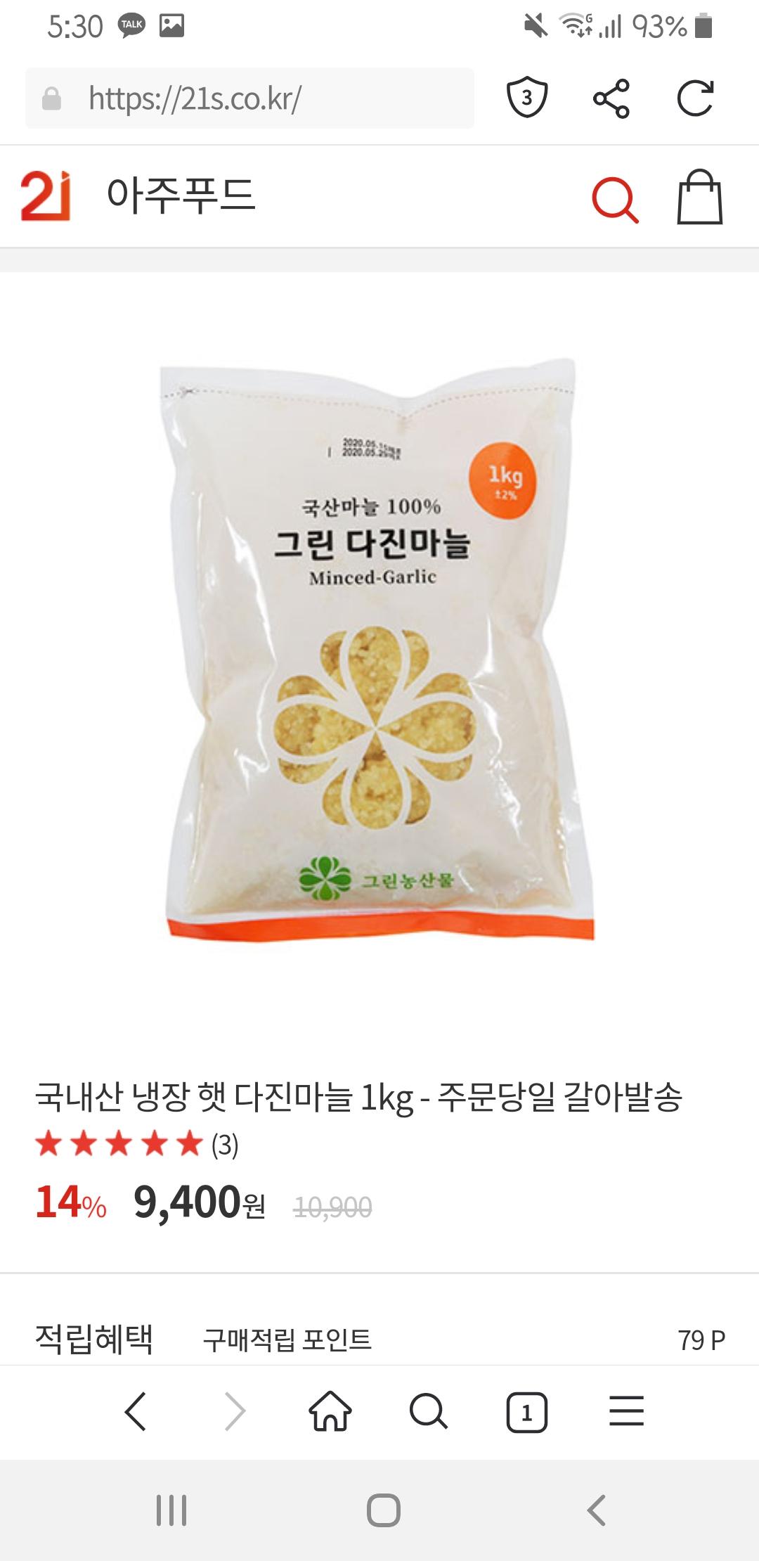 [21s] 국내산 다진마늘 1kg (9,400원/무료배송)