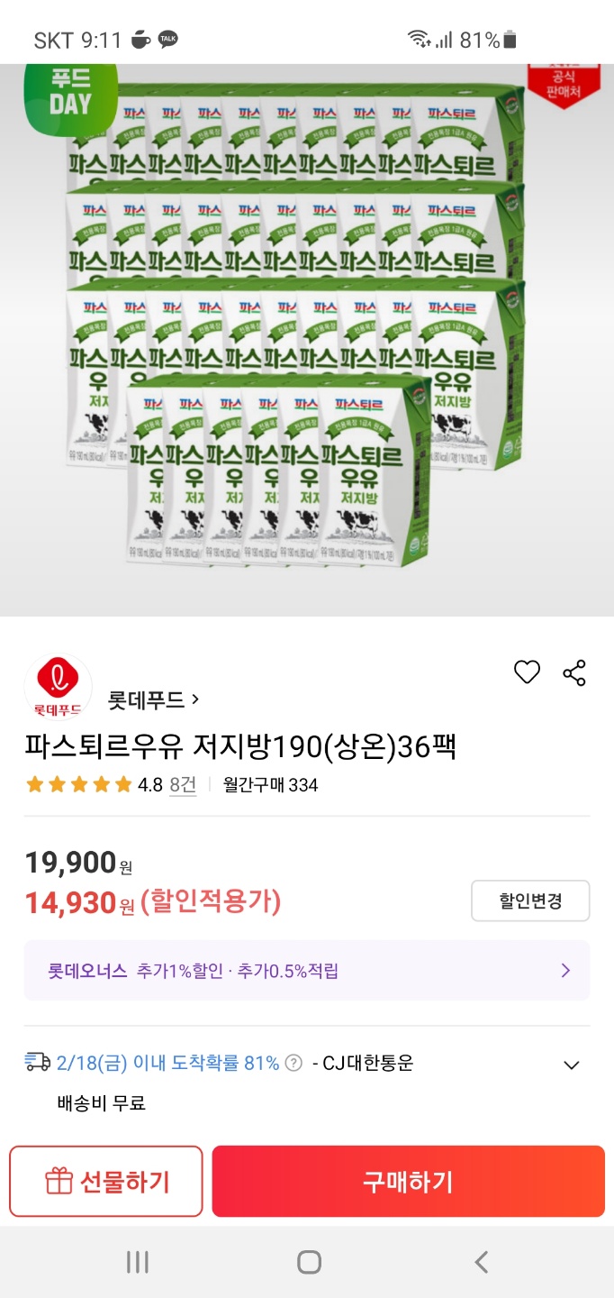 [롯데ON] 롯데ON 파스퇴르우유 저지방190(상온)36팩 최대혜택가 14,184원
