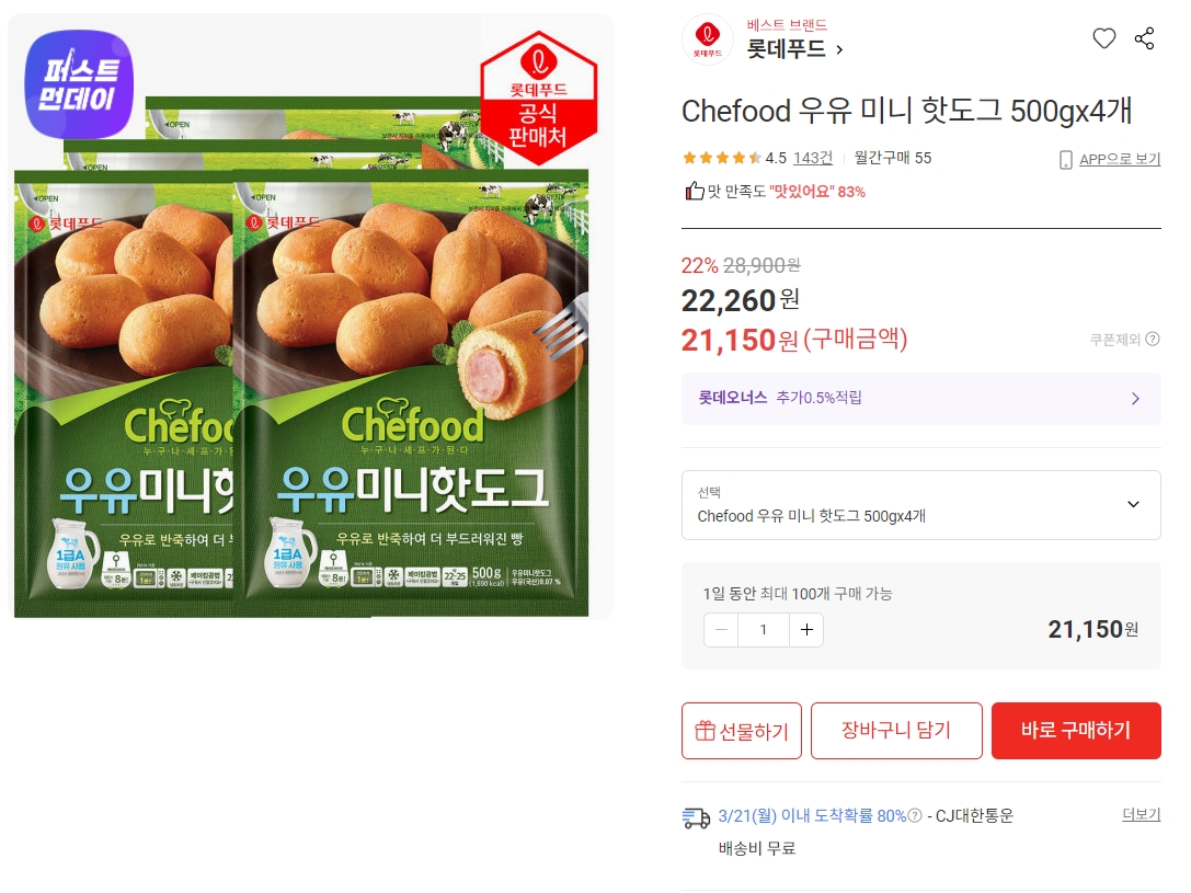 [롯데ON] Chefood 우유 미니 핫도그 500gx4개 > 상품홍보