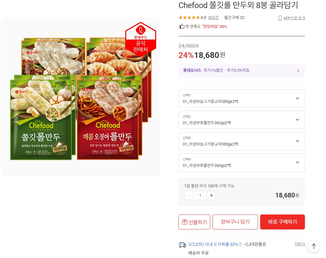 [롯데ON] Chefood 쫄깃롤 만두외 8봉 골라담기/18,680원 무배