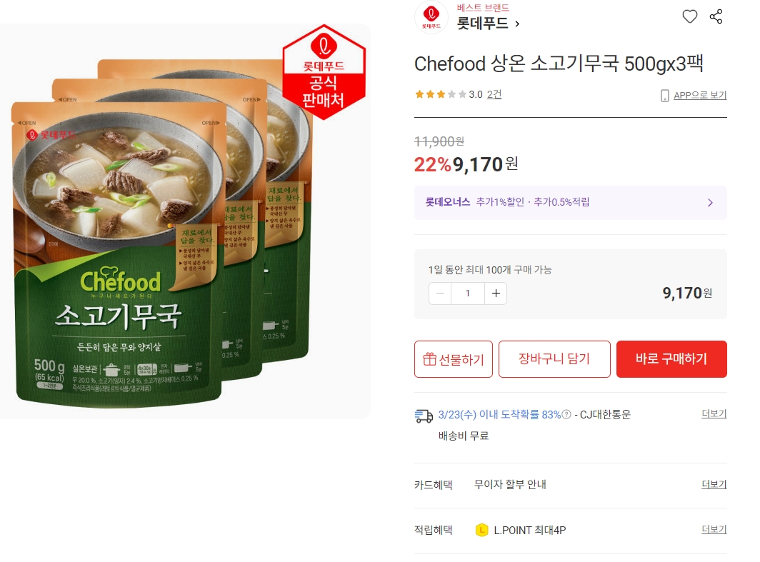 [롯데ON] Chefood 상온 소고기무국 500gx3팩 9,170원 무배 > 상품홍보