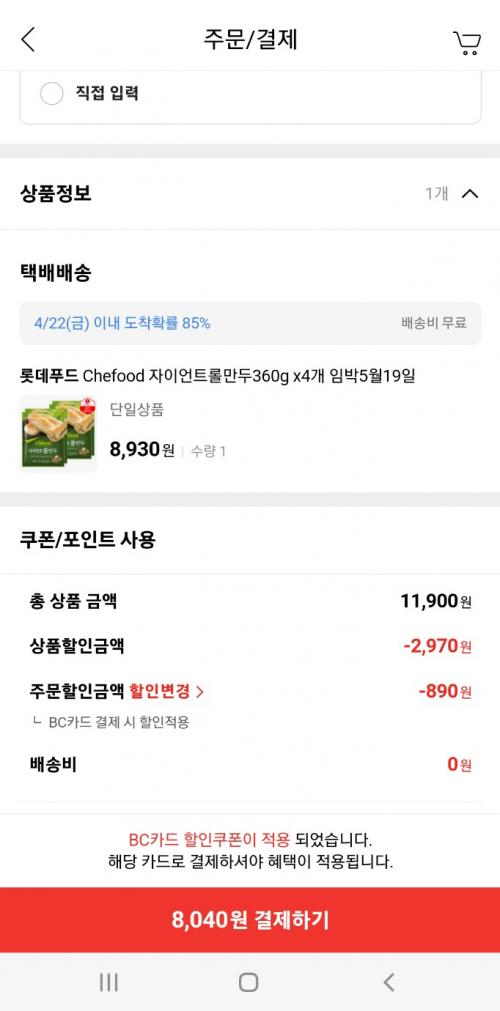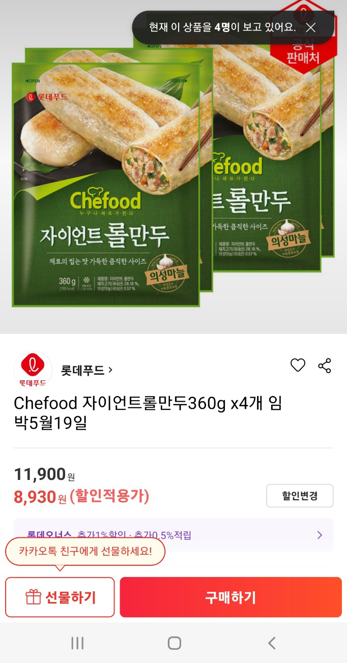 [롯데ON] Chefood 자이언트롤만두360g x4개 임박5월19일 8,040원 무배