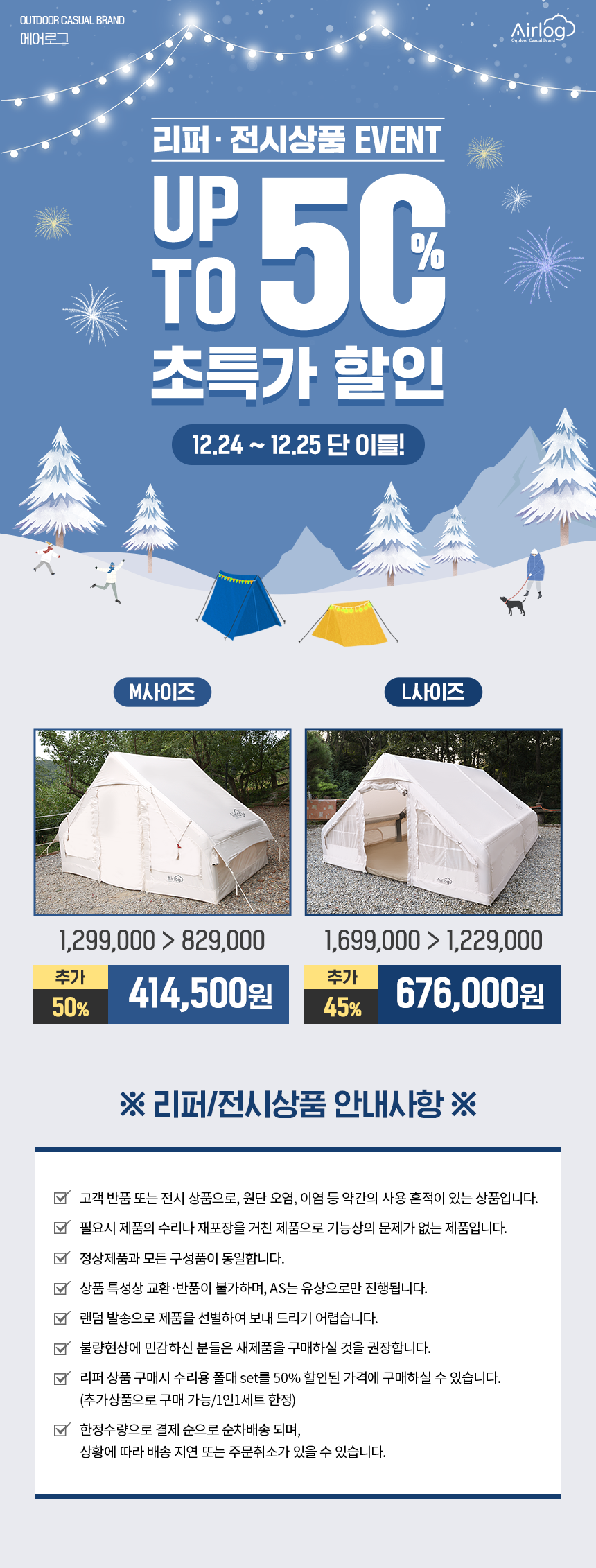 크리스마스를 맞아 언제 어디서나 누구나 쉽게 캠핑을 즐길 수 있는 에어로그 에어텐트를 가장 저렴하게 구매하실 수 있도록 리퍼/전시 제품을 초특가로 판매합니다.