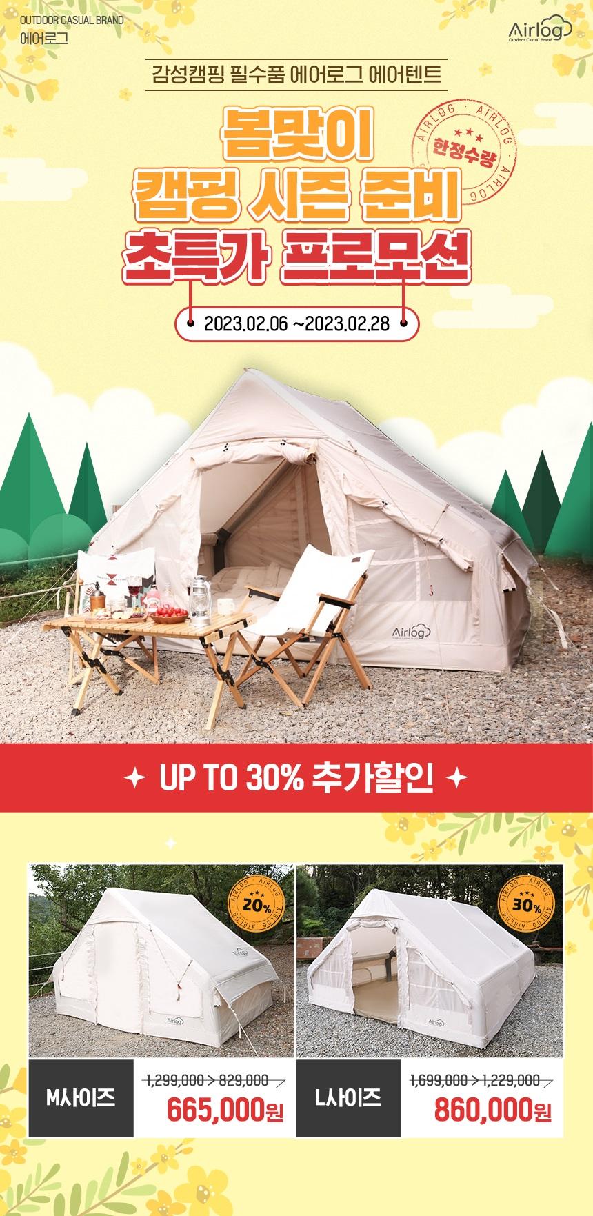 다가올 캠핑 시즌을 맞아 언제 어디서나 누구나 쉽게 캠핑을 즐길 수 있는 에어로그 에어텐트를 가장 저렴하게 구매하실 수 있도록 한정수량 초특가로 판매합니다.