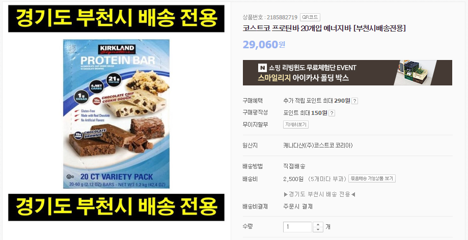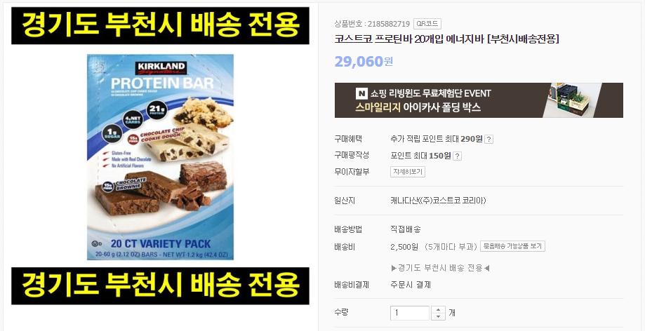 다이어트 및 아침대용으로 유용한 커클랜드 프로틴바를 판매하고 있습니다.